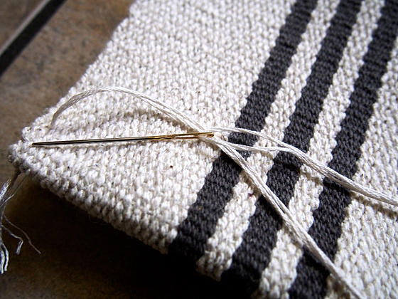 Étape 1 : plier le tapis en deux et coudre chacun des côtés, vous pouvez y aller grossièrement parce que la couture ne paraitra pas à la fin.