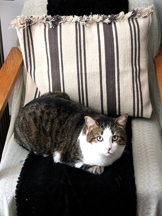 p.s. puisque, question d’éclairage, je n’ai pas réussi à prendre bien des photos du résultat final, j’essaie de me faire pardonner avec une photo du coussin + un mignon chat .