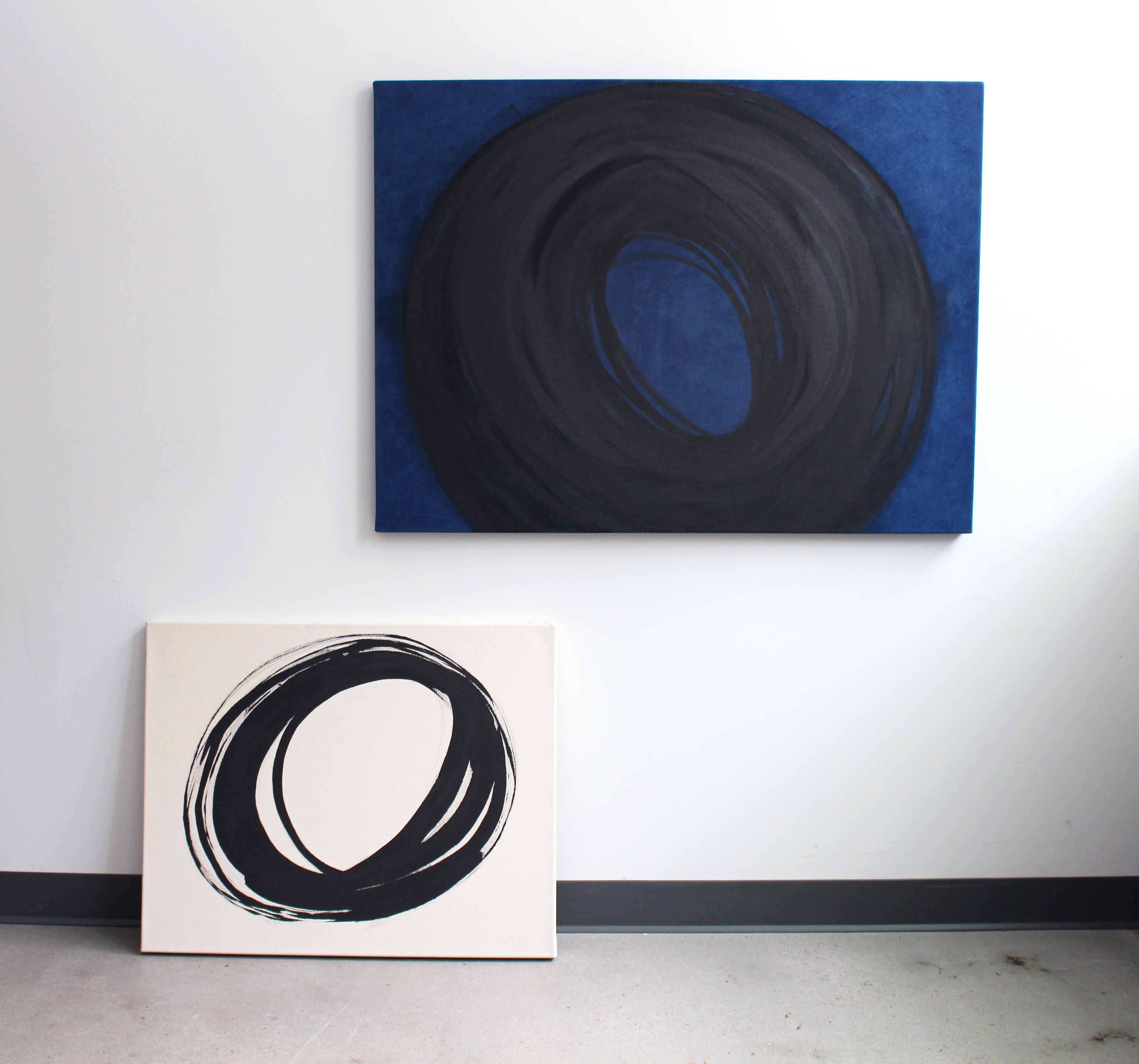 J’ai eu l’occasion de visiter l’atelier de l’artiste Stéphanie L’Heureux, membre du regroupement Pied Carré. Essentiellement peintre et photographe, elle explore aussi la porcelaine et la broderie. Je suis fascinée par ses toiles minimalistes et ses recherches sur le cercle. L’artiste engage son corps, le mouvement de son bras dans toute son amplitude et dans ses limites. Sur les grands formats le cercle dépasse parfois de la toile, il s’agit du plus grand cercle que son bras soit capable de former. Ses toiles sont une recherche d’équilibre entre la forme, le vide, le support et le geste. «Je cherche à revenir à la simplicité, à l’essence du geste, explique-t-elle. Mon approche vise à susciter l’émotion avec un langage minimaliste.»