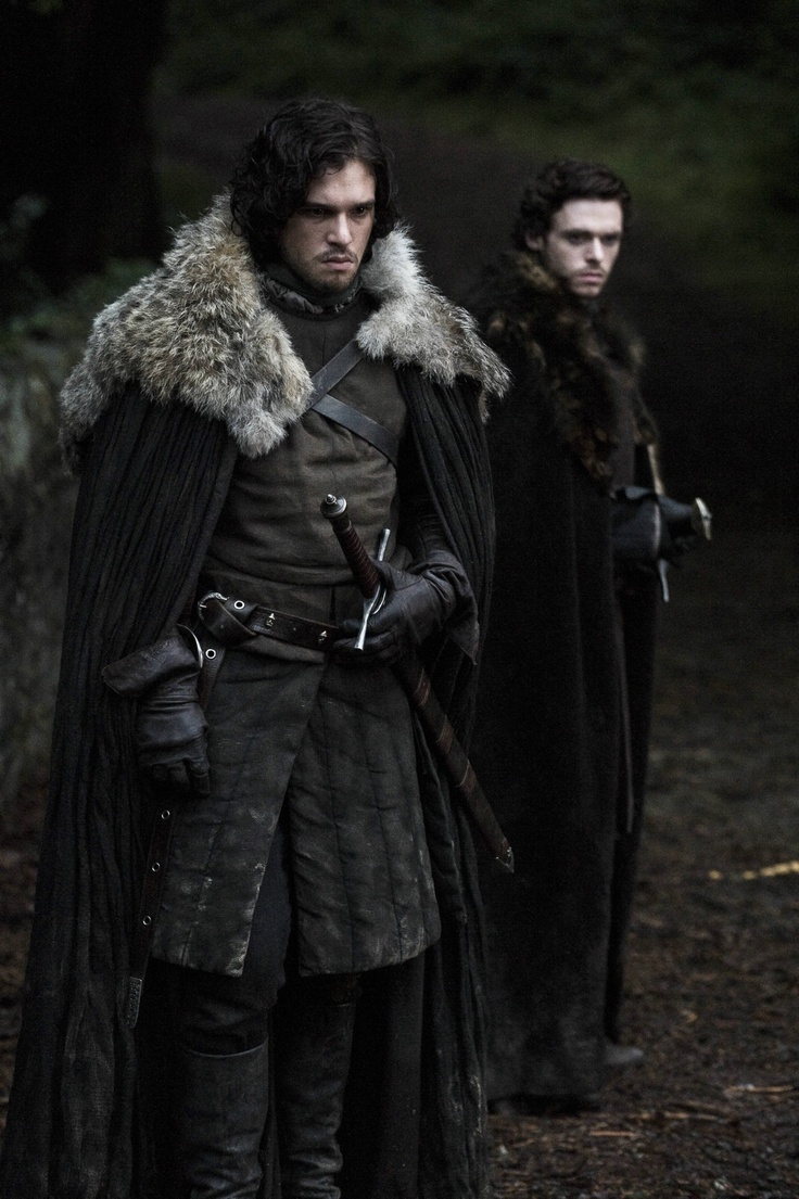 Robb Stark: Fils ainé de Ned Stark, plein de fierté, d’honneur et roi de Winterfell et du Nord en l’absence de son père, son vêtement nous communique son appartenance au Nord et l’honneur de sa famille qu’il porte sur ses épaules. La fourrure du loup, emblème des Stark et matière noble. Les couleurs plus sombres et ternes qu’il revêtit s’opposent à celles du Sud, s’accordent au ciel nuageux et lui confère un air de sévérité et de noblesse.