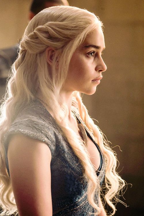 Daenerys Targaryen: Je trouve son personnage très intéressant autant au niveau de sa personnalité que pour son costume. Si l’on remonte à la première saison, son personnage était très effacé. Discrète, elle ne portait que des robes très pâles, vaporeuses, comme une seconde peau puisqu’elle même a le teint pâle. À la deuxième saison, elle aime son peuple de tout son cœur et vit avec eux dans le désert. Son vêtement, plus primitif, est donc à l’image de son peuple et de son milieu, c’est à dire avec des couleurs terre, des textures et des matières brutes. Puis, avec les saisons trois et quatre, alors qu’elle prend de l’importance et qu’elle se consacre à créer une armée pour reprendre le trône de fer, son vêtement devient d’un bleu intense alors que tous ceux qui l’entourent sont de couleurs plus ternes. La texture de son vêtement évoque les écailles de dragons alors qu’elle même est mère des dragons.