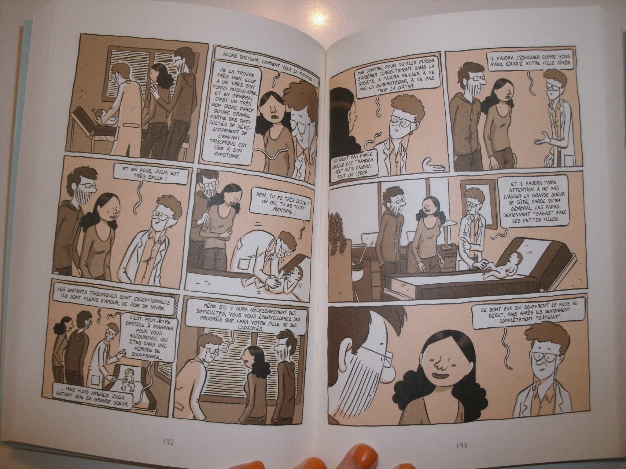 Au cours de ma lecture, j’ai pu constater la tristesse du parent, plus précisément du père, face à sa nouvelle réalité. Et ensemble nous apprenons à aimer sa fille. Tout comme le père, nous sommes heureux des réussites de sa fille, la première fois qu’elle se tient debout, ses premiers pas, etc. Julia semble être l’une des merveilles du monde. Je fus particulièrement touchée lorsque j’ai constaté qu’à la fin de la BD nous pouvons voir des photos de la vraie Julia et comme elle est mignonne !