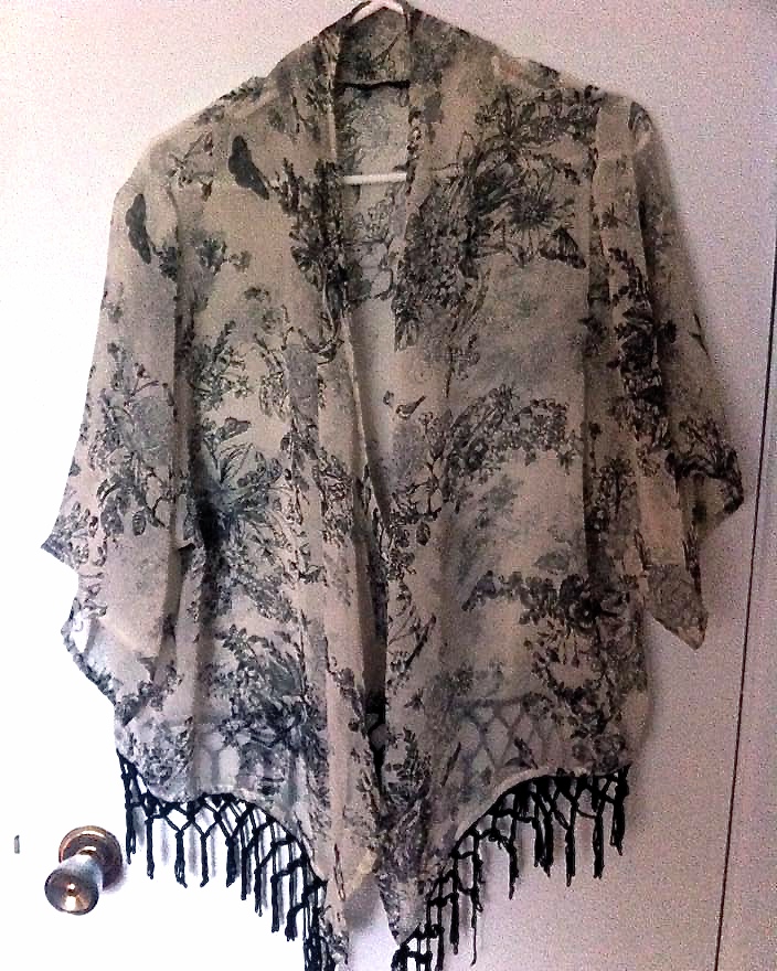 Primark, c’est un magasin de vêtements super populaire en Angleterre. J’ai acheté ce kimono à Londres, durant un voyage en Europe il y a deux ans et le je le trouve toujours aussi beau. Il m’a suivie durant les chaudes journées en Italie et bien souvent après, à mon retour. Au moment où je l’ai acheté, je trouvais ça original les kimonos et je me trouvais bien avant-gardiste (je suis un peu naïve parfois). Pour moi, il représente le voyage, l’aventure et l’été.