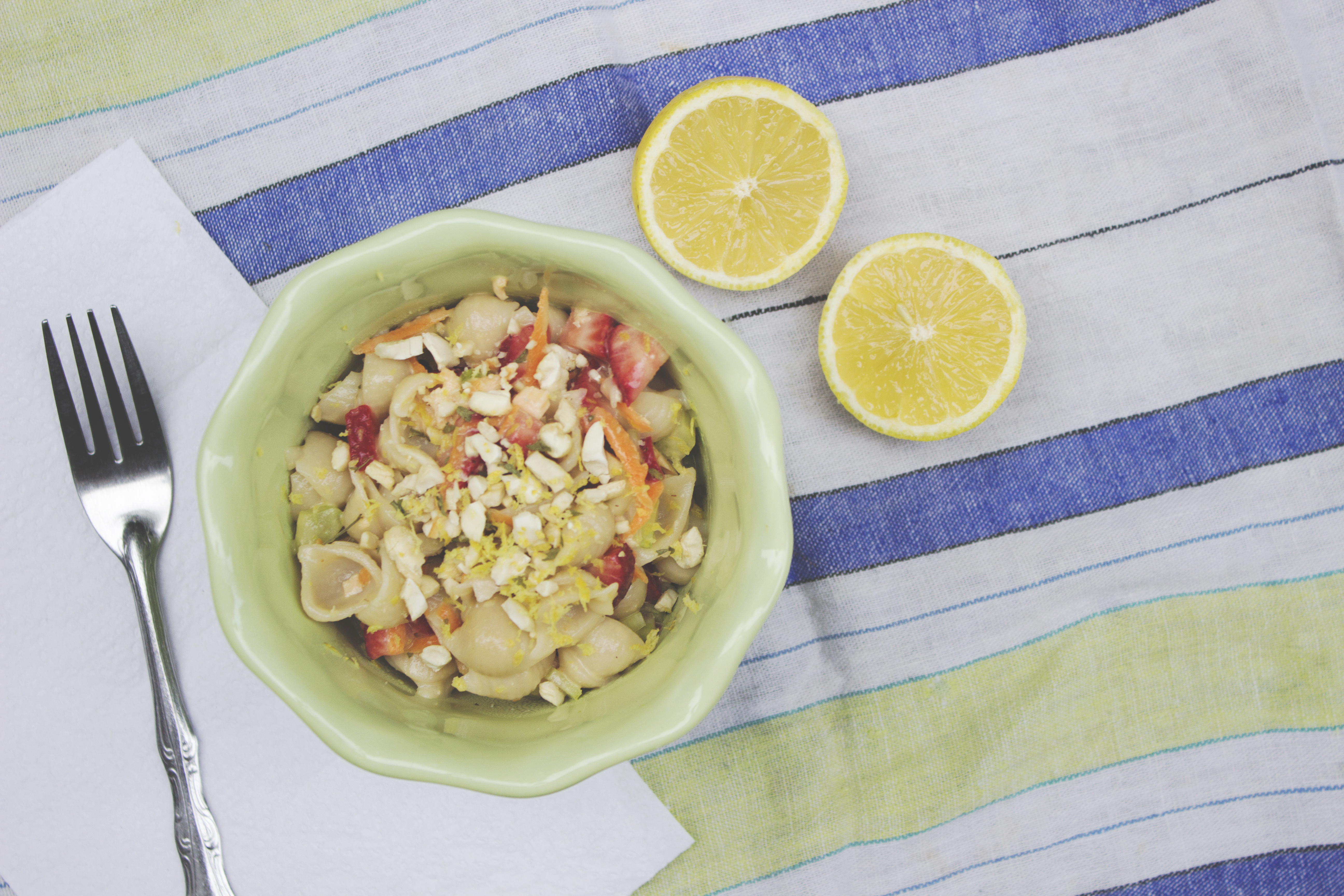Faire cuire les pâtes et le saumon (je suggère d’assaisonner le saumon avec de l’huile d’olive, sel et poivre, du jus de citron et de l’estragon lors de la cuisson en papillote, soit dans du papier d’aluminium). Préparer les ingrédients et la vinaigrette. Mélanger tout ensemble. Pour la présentation, ajouter le zeste de citron sur le dessus de la salade avec un peu de persil.