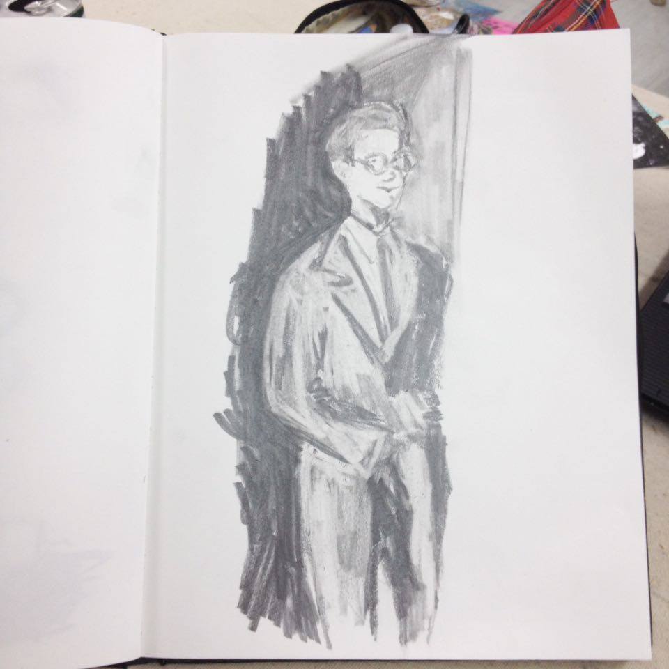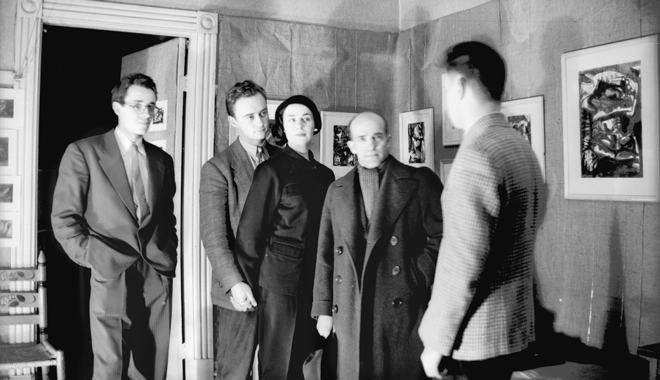 Il y a près de deux mois, j’ai participé à un séminaire de peinture, offert ici à Percé, dirigé par le peintre Jimmy Perron, originaire de l’Isle-aux-Coudres dans Charlevoix (Baie-Saint-Paul). Un certain matin, Jimmy nous invite à choisir une image/photo à partir de laquelle nous esquisserons quelques croquis, pour ensuite entamer un tableau issu des impressions laissées par ces croquis. Après avoir vogué quelques minutes dans ma banque d’images, je me suis arrêté sur une photographie en noir et blanc où apparaissent plusieurs automatistes. La photo a été prise lors de la seconde exposition du groupe, en 1947, au 75, rue Sherbrooke Ouest, chez la maman des Gauvreau. J’y reconnaissais Pierre, Claude et Paul-Émile Borduas. Seuls une femme et un autre homme me restaient plutôt mystérieux. Au lieu de demander l’aide de Google, sans me donner la peine de chercher autres part, je préfère laisser, parfois, les informations venir à moi. Je ne suis pas pressée de toute façon ! La femme (Madeleine Arbour) était probablement l’amoureuse de Pierre, à la façon dont ils se tenaient la main. L’homme, avec son air timide et son allure ténébreuse et chic et ses énormes lunettes se tenait légèrement à l’écart, comme s’il s’apprêtait à quitter la scène. J’ai choisi d’abord la photo pour sa composition parfaite, pour finalement concentrer toute mon attention sur l’homme énigmatique. C’était Marcel Barbeau, mais je ne le savais pas encore à ce moment-là.