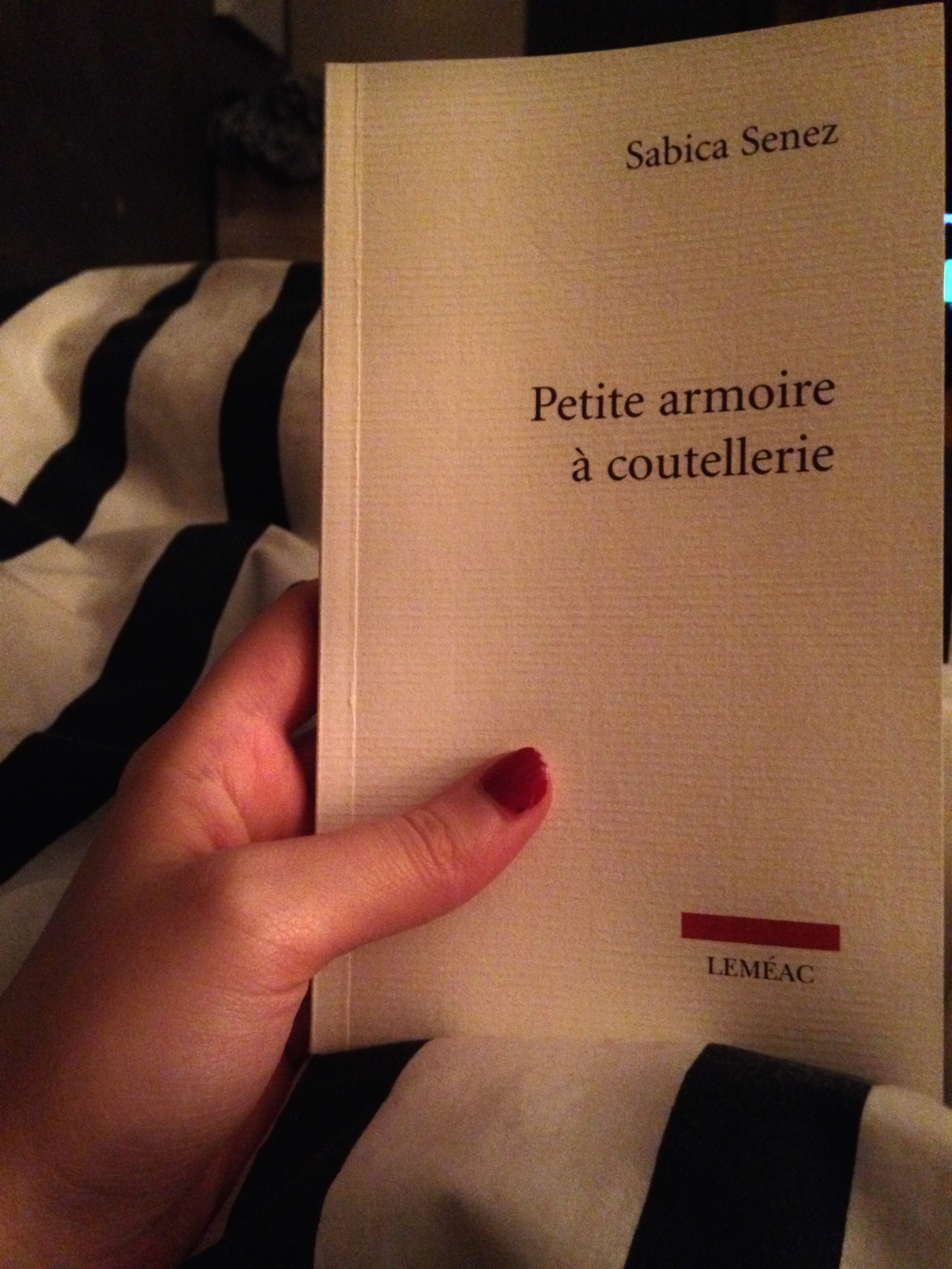 Ma deuxième lecture thématique deuil amoureux était Petite armoire à coutellerie de Sabica Senez. Hybride entre le roman, la poésie et le carnet de notes, Petite armoire à coutellerie nous entraîne littéralement en plein cœur d’une peine d’amour. La narratrice note au gré de ses envies ses émotions et ses pensées vis-à-vis l’amour perdu, trahi. Elle aborde ses vieux souvenirs douloureux, les heureux aussi et les autres, où elle a tenté de l’oublier dans les bras d’autres. J’avais réellement envie tout au long de ma lecture de m’arrêter et de noter les phrases tellement elles étaient belles. Je passais mon temps à me dire Je dois noter celle-là, je dois l’écrire dans l’article. Or, comme c’est arrivé au moins une douzaine de fois, je vais seulement en noter une. Et surtout vous inciter à courir le lire. J’ai rarement lu des phrases si coup de point pour décrire la peine de cœur et tout l’arc-en-ciel noir-gris d’émotions qui l’accompagne.