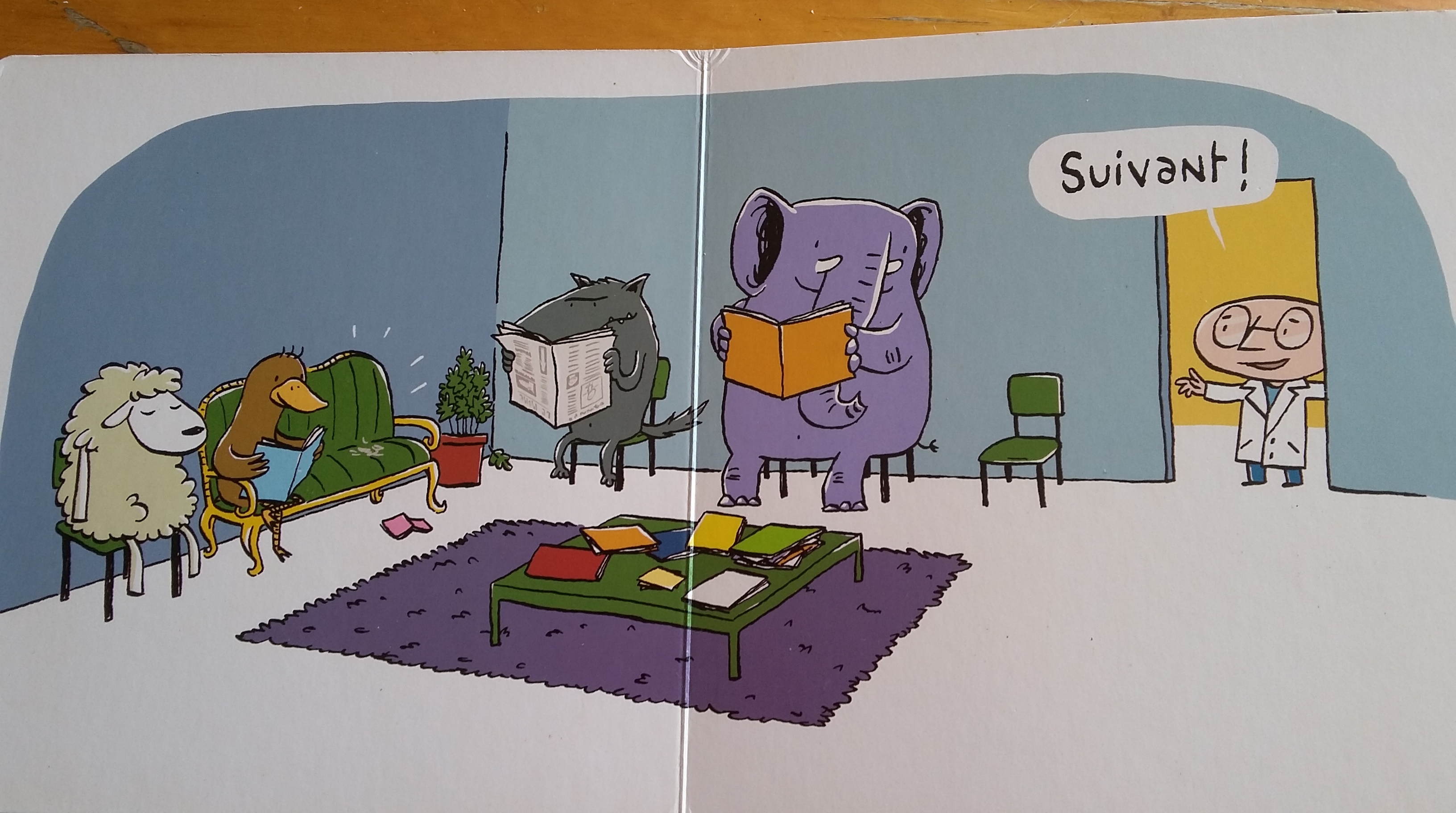 Bonjour Docteur nous amène chez le médecin. Plusieurs animaux attendent dans une salle d’attente qu’on vienne les chercher. La fin surprend parce qu’on ne le voit vraiment pas venir. Et pourtant, on a des indices si on revient quelque peu en arrière…