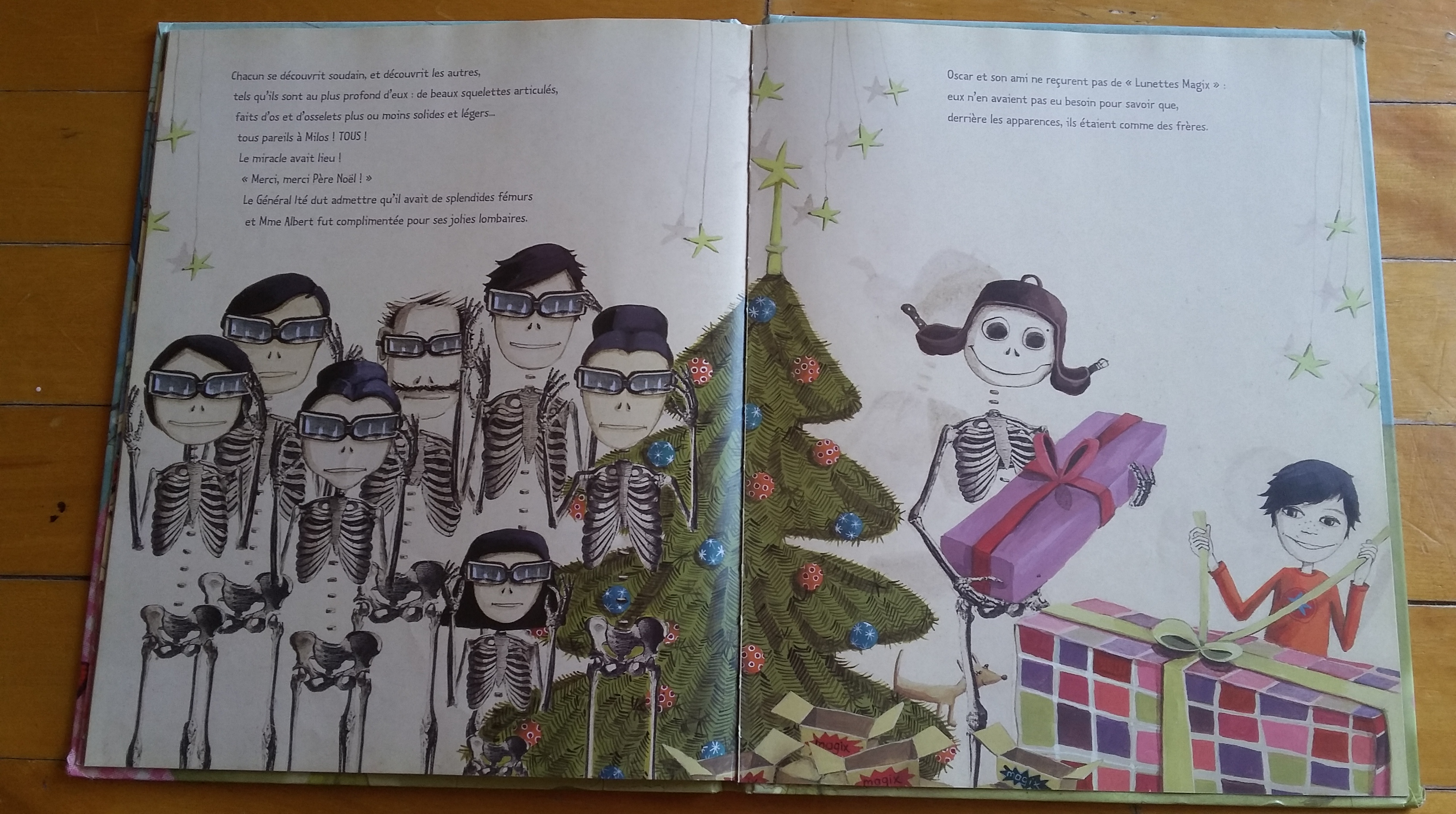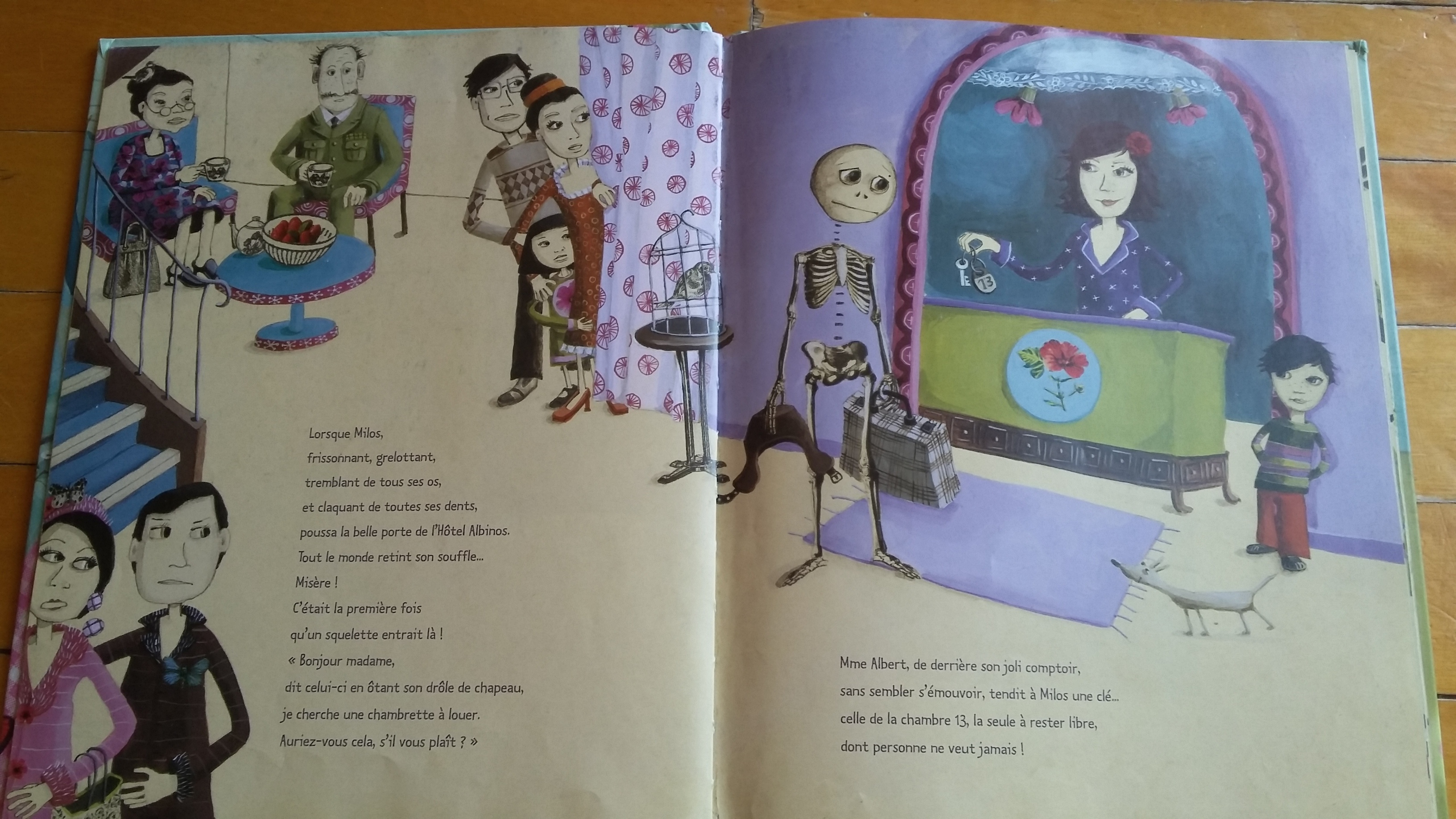 Milos est un livre extraordinaire. Il raconte l’arrivée d’un être étrange, un squelette appelé Milos, dans un hôtel où tout est beau, parfait, rangé, harmonieux. Celui-ci se moque bien de ce que les autres pensent, bien qu’on dise toute sorte de choses sur les gens comme lui, par moquerie, ou simplement par ignorance. C’est quand Milos leur offre une paire de lunettes spéciales que tous se rendent compte qu’ils sont, au fond, pareils à l’intérieur. Belle façon d’illustrer le cercle vicieux des idées reçues et l’acceptation des différences.