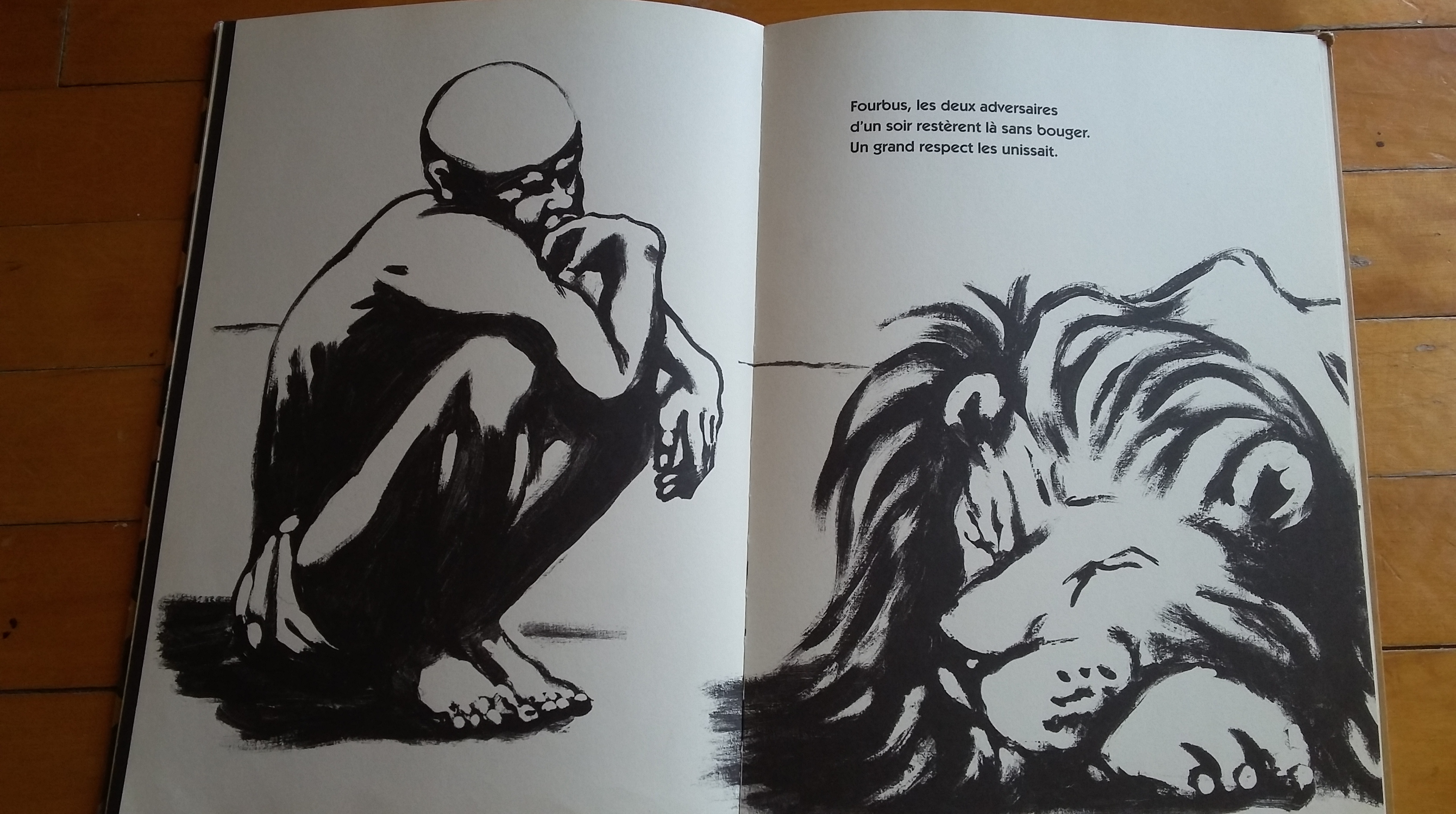 La trilogie de Thierry Dedieu est remplie de valeurs comme le respect, l’entraide, la solidarité. Il met en scène la relation d’un jeune homme avec un lion, devenus malgré tout amis et liés l’un à l’autre malgré leur nature qui les pousserait à se détruire. Beaucoup de scènes sont très belles, fortes, et les illustrations sobres sont très réussies. Une oeuvre d’art en soi.