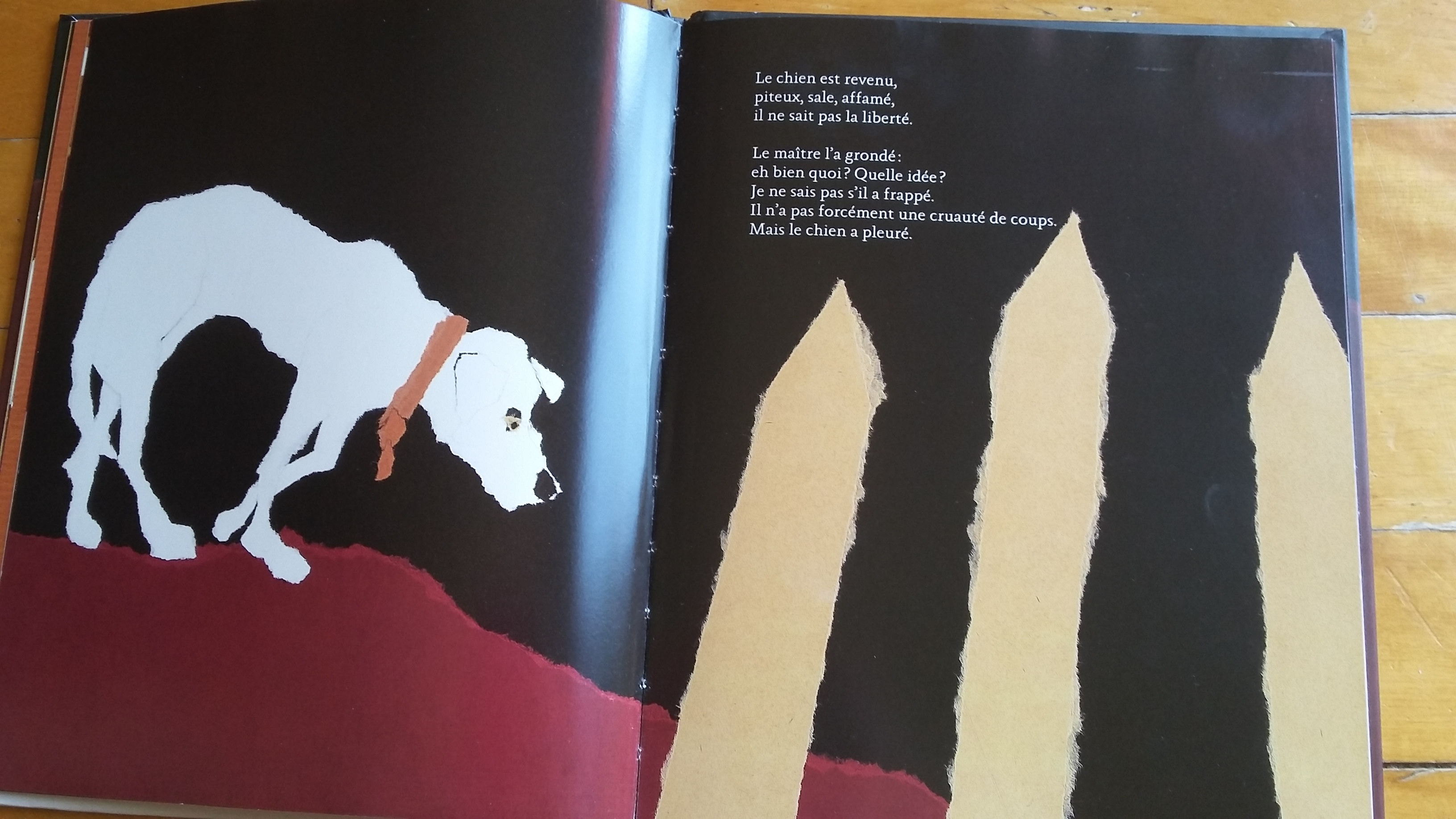 Ce livre touchant est violent parce qu’il exprime avec justesse et vérité l’enfermement, la captivité. Ce chien, qui ne rêve que de liberté, est incapable de se débrouiller dehors seul, à avoir passé trop de temps attaché. Il souhaite la découvrir, attend avec impatience les moment où son maître le fait sortir avec lui, mais même ce dernier a de la misère à le maîtriser et finit par le laisser enfermé, puis à s’en débarrasser. J’en avais les larmes aux yeux tant les mots ont bien décrit l’injustice de cette triste vie.