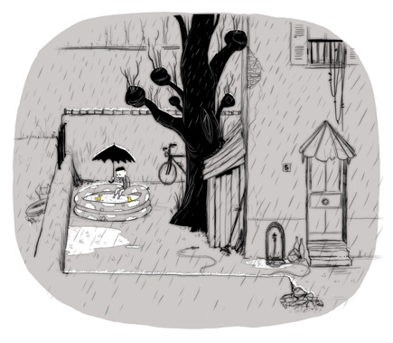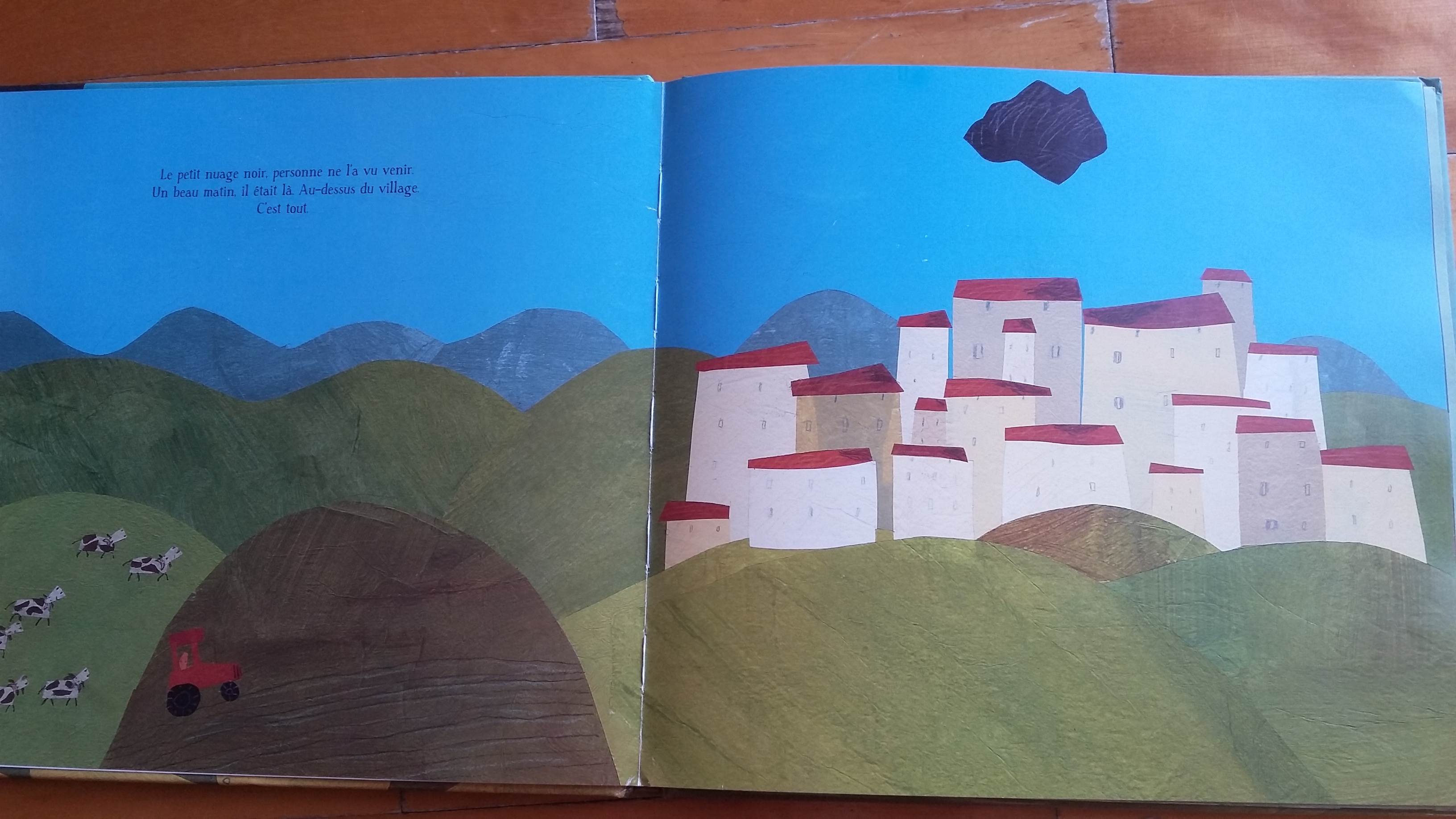Tout allait bien dans la ville de Tempête jusqu’à ce qu’un petit nuage apparaisse. Tout le livre est consacré aux efforts donnés par les habitants pour se débarrasser de ce nuage peu bienvenu, jusqu’à ce qu’on se rende compte, une fois celui-ci enfin parti, qu’il est nécessaire à nourrir les plantes qui, sans lui, meurent. Belle métaphore d’acceptation des émotions sombres et qui parle, en mon sens (même si c’est très caché), de dépression.