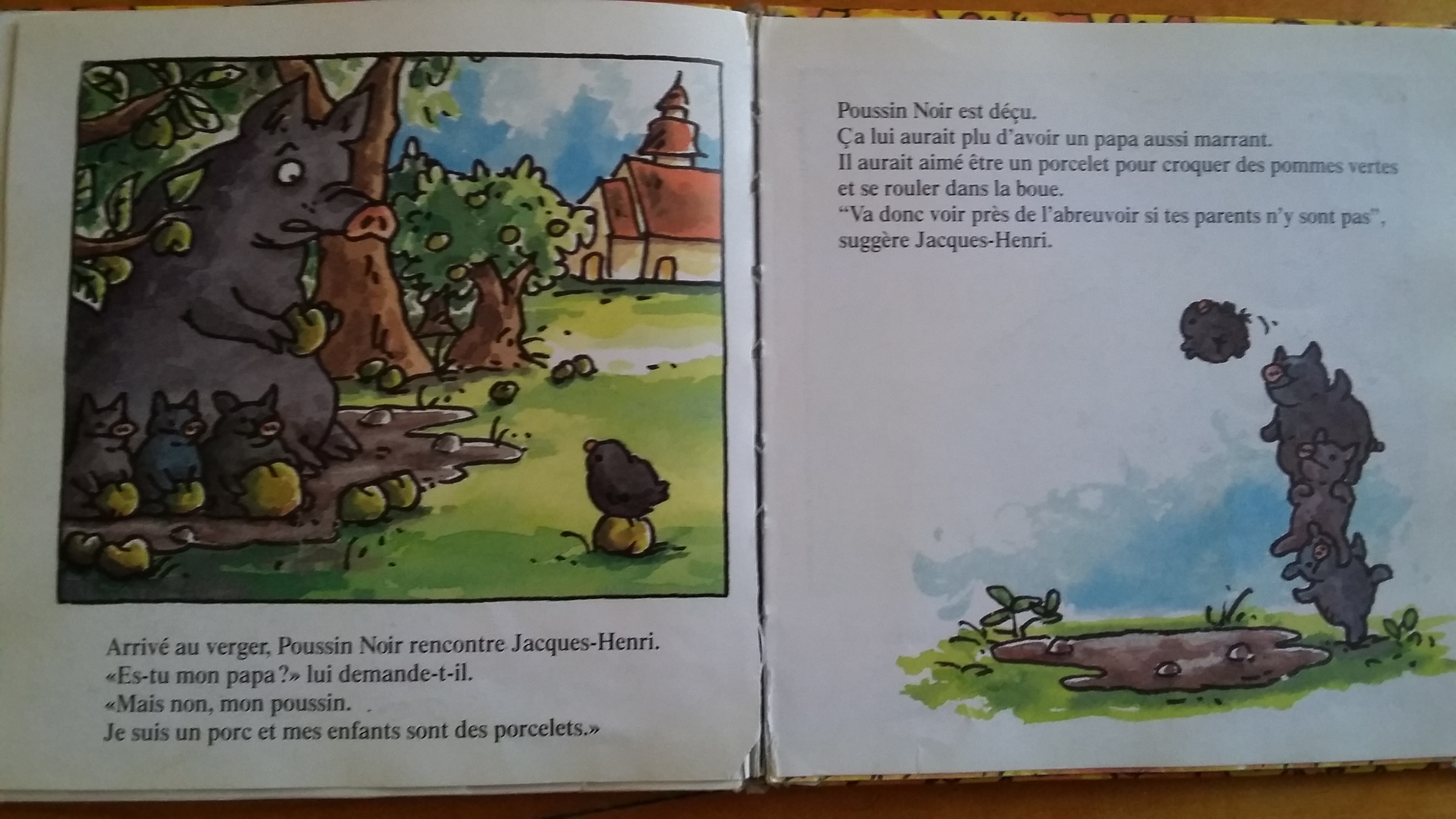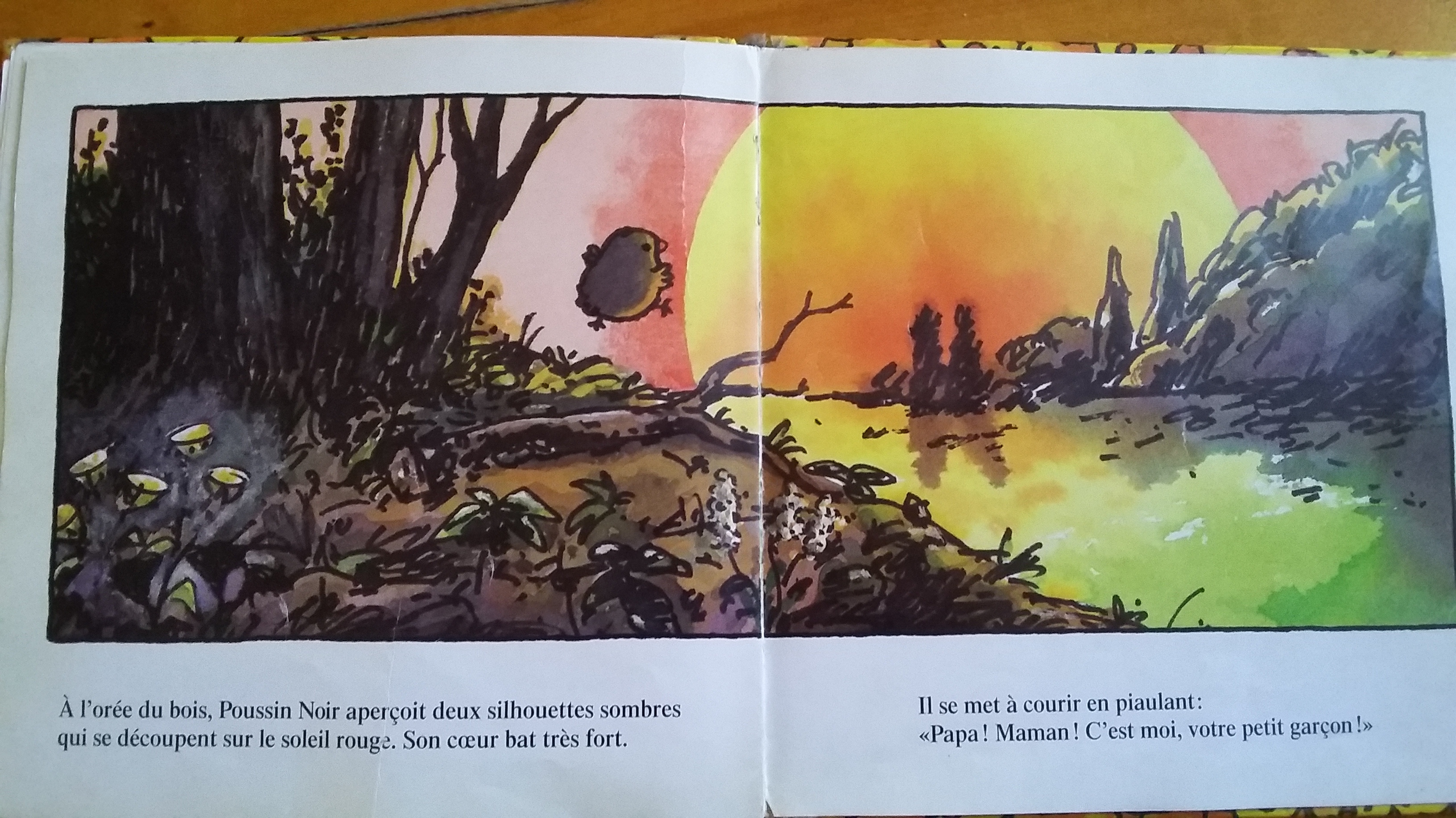 Poussin noir, c’est l’histoire d’un petit poussin différent, né noir alors que tous les autres sont jaunes. Convaincu qu’il n’appartient pas à sa famille, il part à la recherche de ses vrais parents, en demandant à tous les animaux noirs qu’il croise s’ils le sont. Plus que surprenante, la fin est choquante!