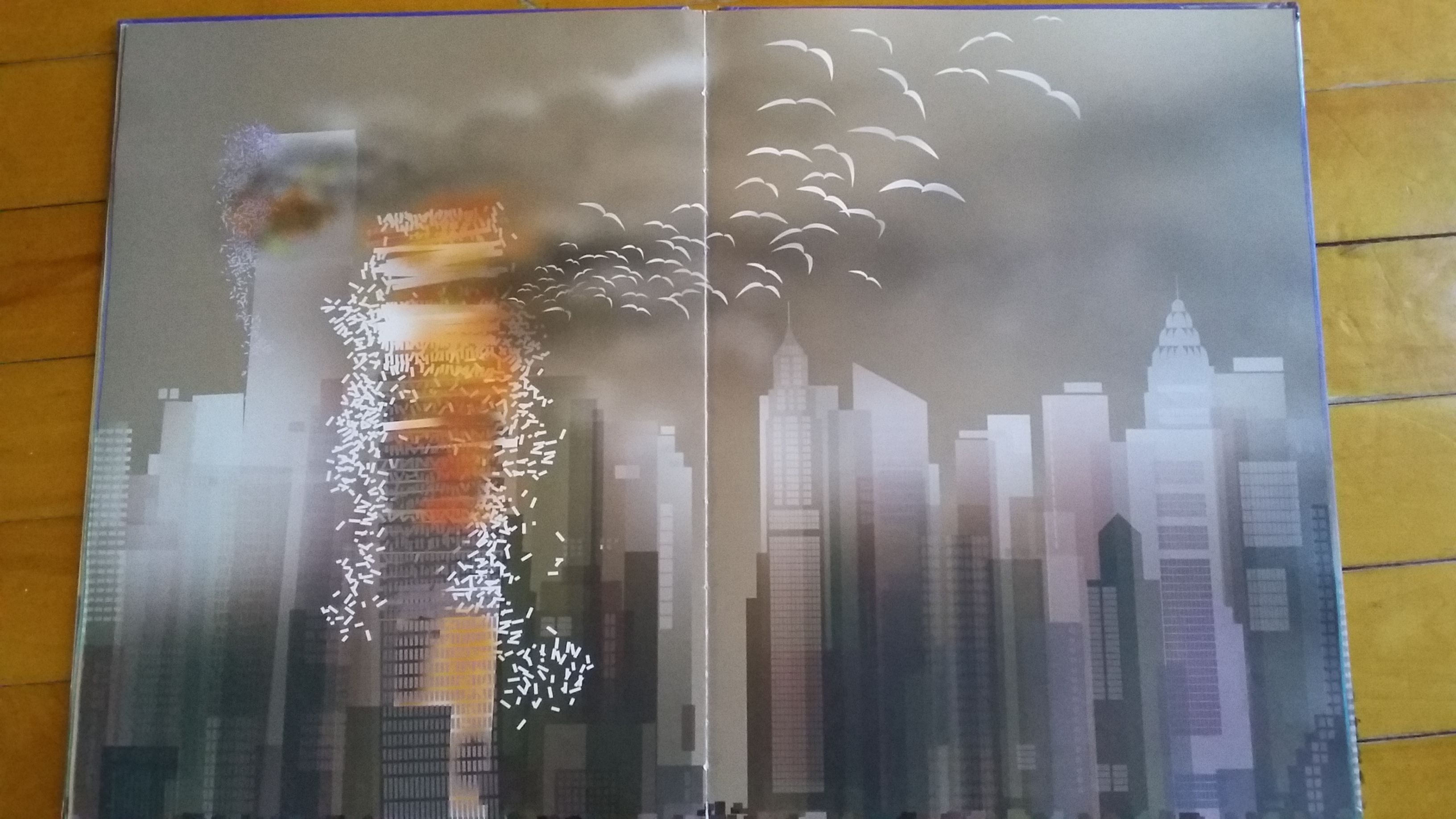 Il n’y a pas beaucoup de texte, surtout des illustrations, dans ce livre qui aborde les attentats du 11 septembre 2001. Mais celles-ci sont fortes et éclatantes. Il s’en dégage également une grande poésie, particulièrement dans l’image de ces oiseaux qui s’échappent des deux tours lorsque celles-ci s’effondrent. Une belle manière d’aborder un sujet délicat.
