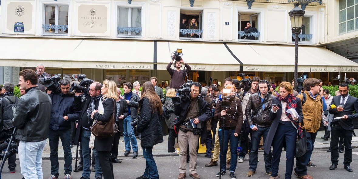 ©Christophe Petit Tesson/MAXPPP – 07/11/2012 ; PARIS ; FRANCE – Les journalistes attendent devant le restaurant Le Drouant rue Gaillon a Paris ou est decerne le prix Goncourt..
