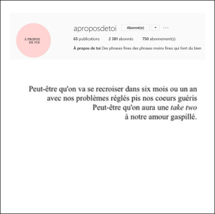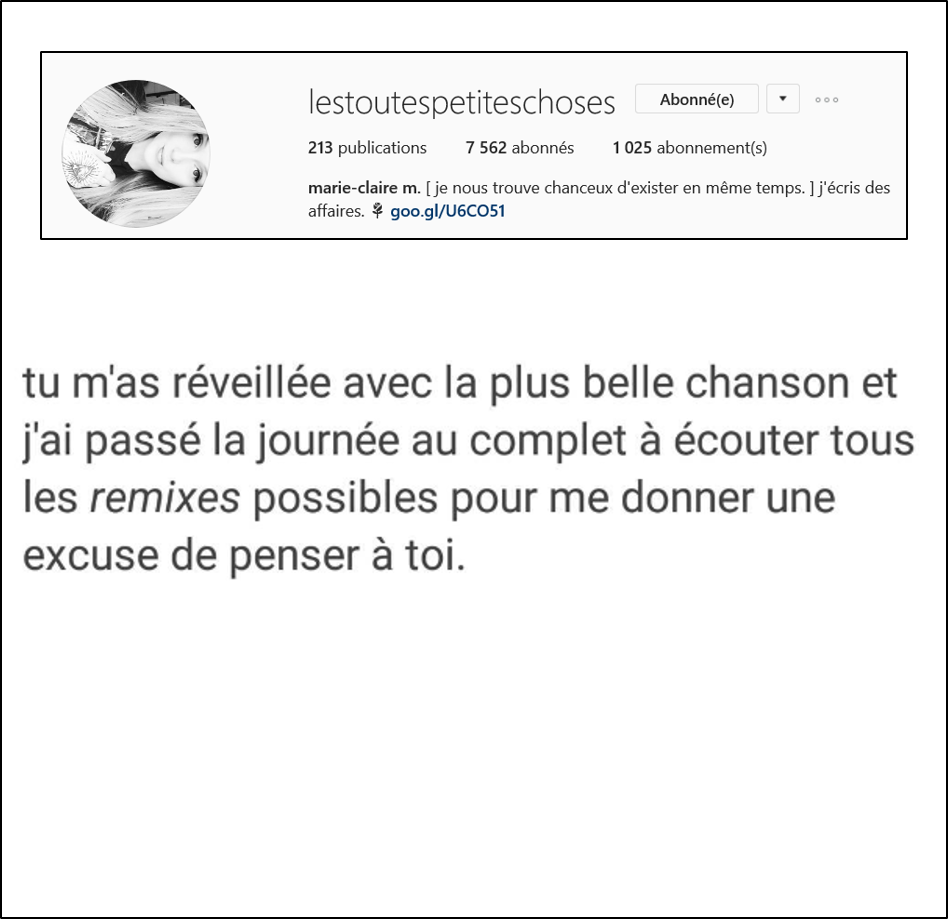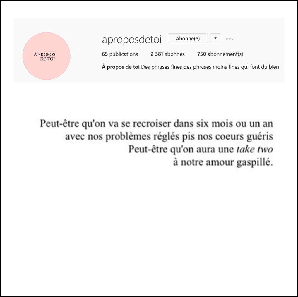 Merci aux gentil(le)s inconnu(e)s derrière ces pages d’avoir accepté de vous livrer à moi. Merci de publier vos écrits/pensées comme vous le faites si bien, vous donnez beaucoup de bonheur aux gens quand on voit vos petits bouts de phrases sur Instagram entre 2 photos parfaites. Vous êtes aussi une belle petite communauté qui semble se donner beaucoup d’amour entre vous et ça, je trouve ça franchement beau dans cette ère de haine virtuelle qu’on côtoie trop souvent.