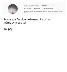 @crachezdesmots (mon seul garçon trouvé au moment d’écrire ces lignes) – J’ai écrit mon premier livre l’an dernier, pour le faire publier cette année, cependant n’ayant toujours pas de correcteur ni de maison d’édition j’ai mis ça en « stand-by ». (…) J’ai toujours trouvé plaisir à écrire avec des gens qui font partie de ma vie, et récemment avec une amie la phrase qui revenait souvent était « crachez des mots ».