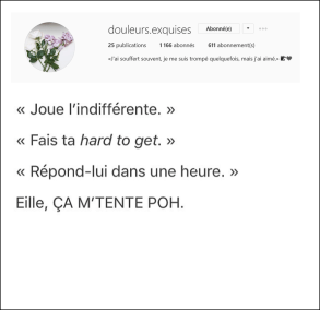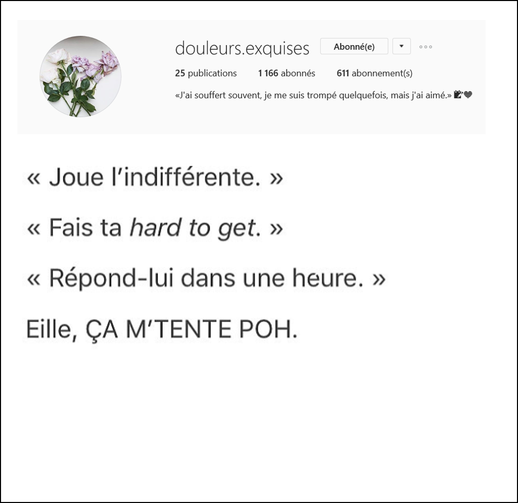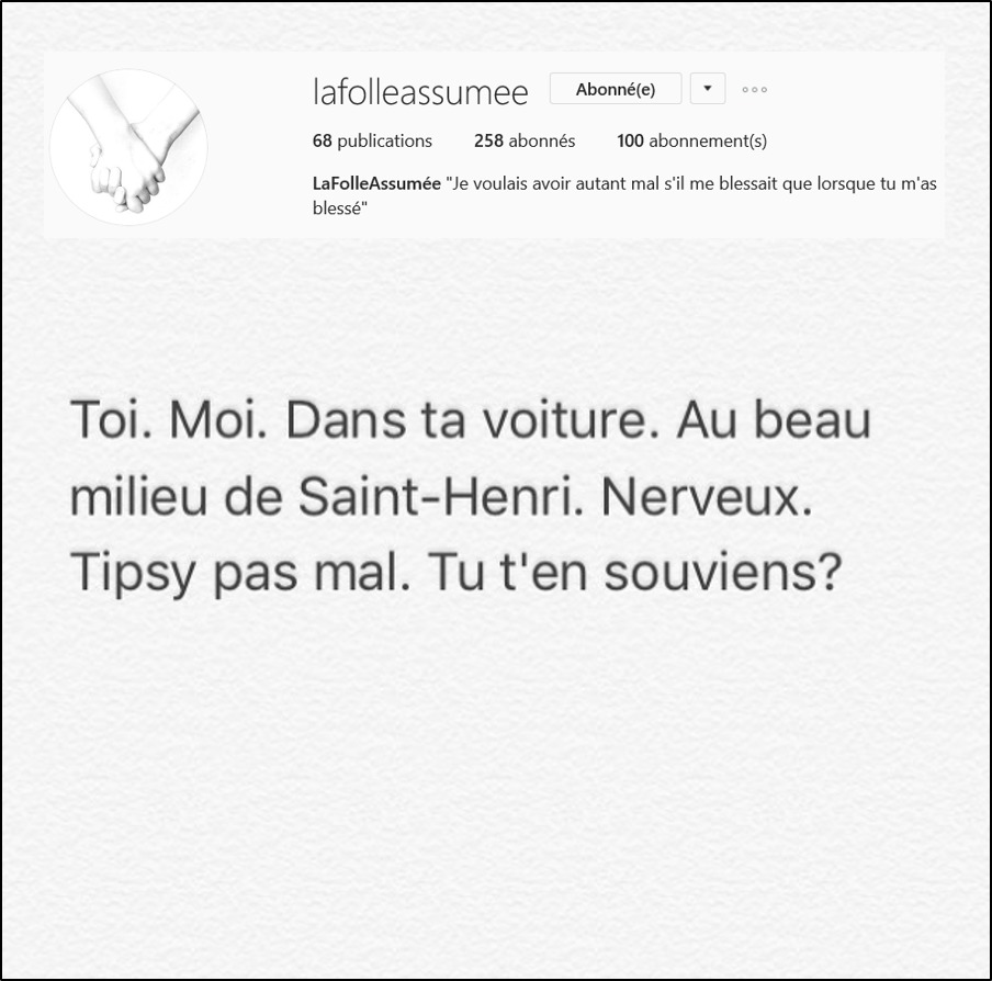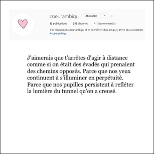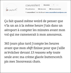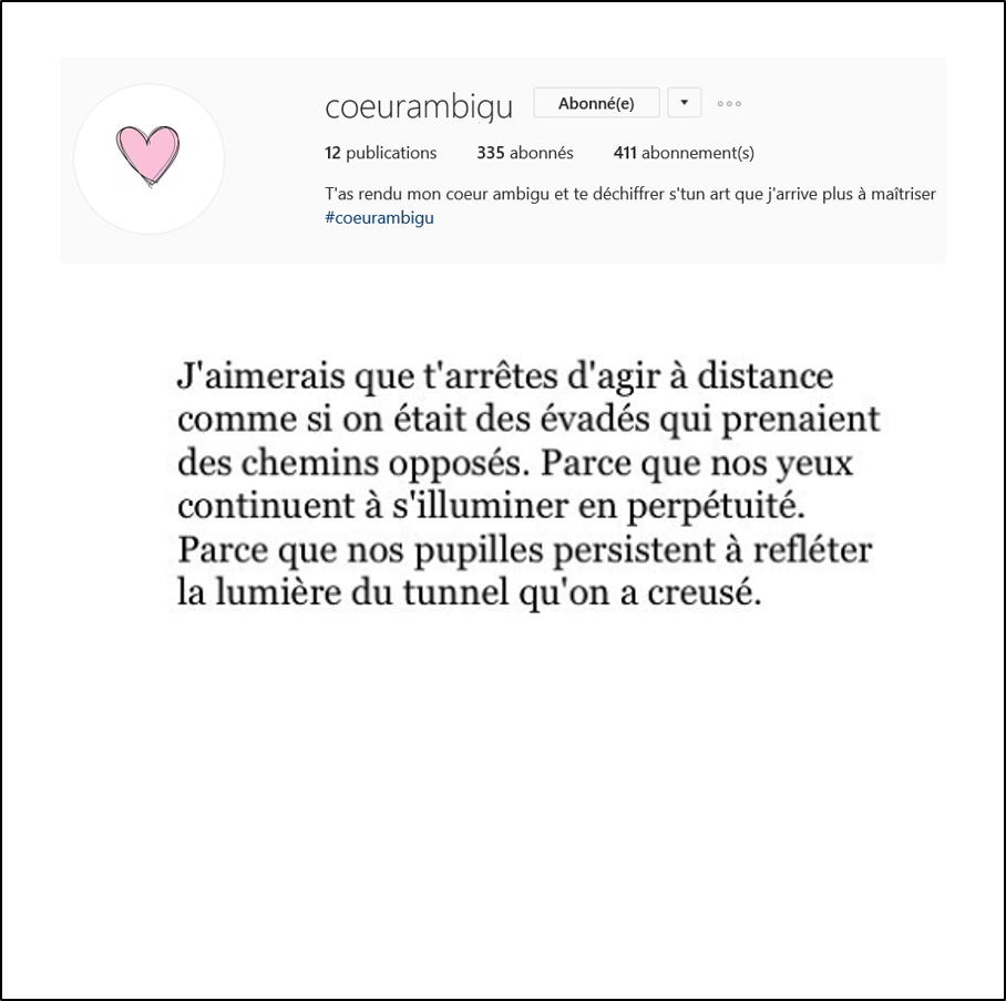 @coeuresilient – Il y a 2 ans, je suis tombée amoureuse au premier regard d’un gars. J’ai raconté notre histoire sur mon blogue puis alors que je vivais ma peine d’amour, j’ai décidé de créer une page Instagram avec des extraits de mes textes pour faire connaître mon style d’écriture.