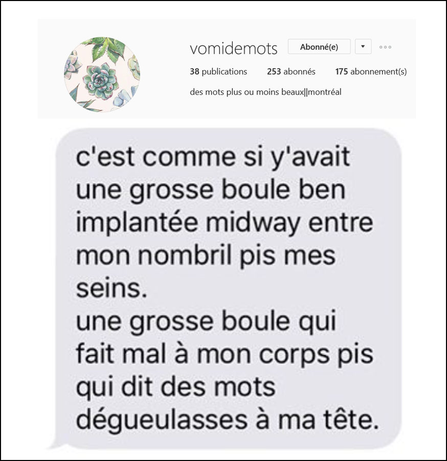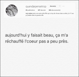 Puis, j’ai vu qu’il y avait des gens qui publiaient le genre de pensées que j’avais donc j’me suis mise à les publier aussi pour permettre aux autres de se sentir moins seuls dans ce qu’ils vivent.
