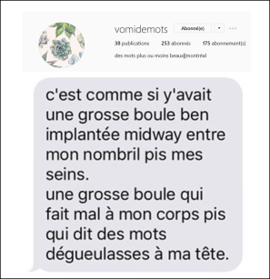 Il y a 2 ans, je me suis décidée à faire le certificat en création littéraire à l’UQAM et ça m’a aidée à sortir de ma coquille (…). Il y a presque un an, j’ai décidé de sortir de ma zone de confort et de commencer une page Instagram. (…) La réaction des gens m’a complètement déstabilisée. Je suis rendue à plus de 8000 followers et je capote. Je reçois tellement de messages de la part de jeunes filles qui me disent que mon écriture les aide à passer à travers toutes sortes d’épreuves (…). Savoir que mes p’tits mots niaiseux peuvent faire du bien a des inconnu(e)s, c’est la meilleure affaire du monde. Bref, je suis une émotive. Je suis impulsive et j’ai BESOIN d’écrire dans ma vie.