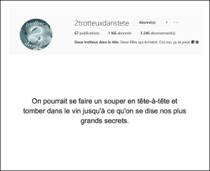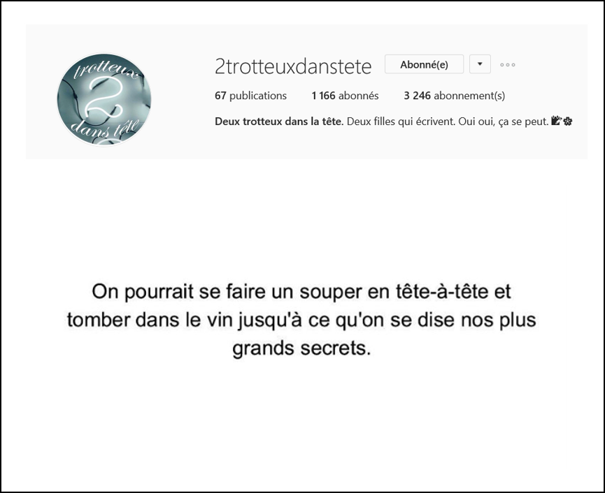 @2trotteuxdanstete – Nous sommes 2 étudiantes en littérature au cégep. Il y en a une de nous deux qui écrivait déjà de la poésie (V).