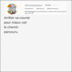 @desmotspasdoux – J’ai commencé @desmotspasdoux sur un coup de tête. Ayant quelques phrases poético-cutes sauvegardées en secret dans les notes de mon cellulaire, j’ai rapidement inventé un nom sorti de nulle part, choisi une œuvre de Gaston Chaissac et créé une page.