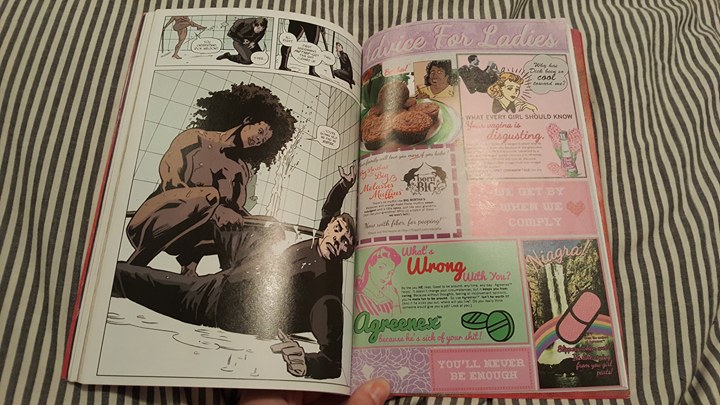 Il va sans dire que ce simple concept est aberrant et choquant. Je me suis demandée lors de ma lecture: « comment peut-on penser à une idée aussi extrême ? » puis j’ai analysé ce concept en fonction de la société actuelle. Résultat: je comprends. Les auteur.e.s modernes créent des fictions puissantes pour dénoncer des réalités graves, comme Margaret Atwood avec La servante écarlate. Bitch Planet est comme un miroir déformant, ce qu’on voit n’est pas tout à fait la réalité, mais on y discerne les éléments majeurs qui permettent d’identifier le vrai du faux et d’en faire un portrait global.