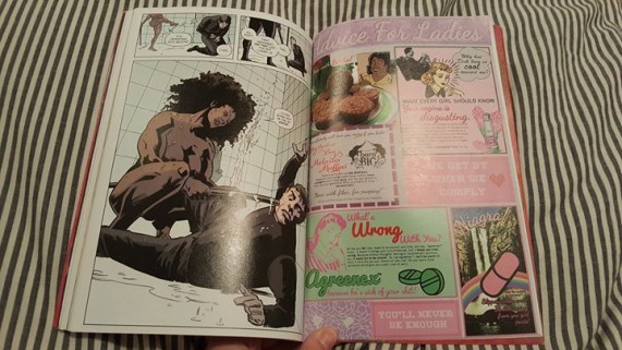 Un autre point fort du volume est sans doute la fin des chapitres. On sort du contexte narratif pour avoir une page de petites annonces qui expliquent aux femmes divers faits avec un sarcasme fendant. Voici quelques exemples d’annonces :