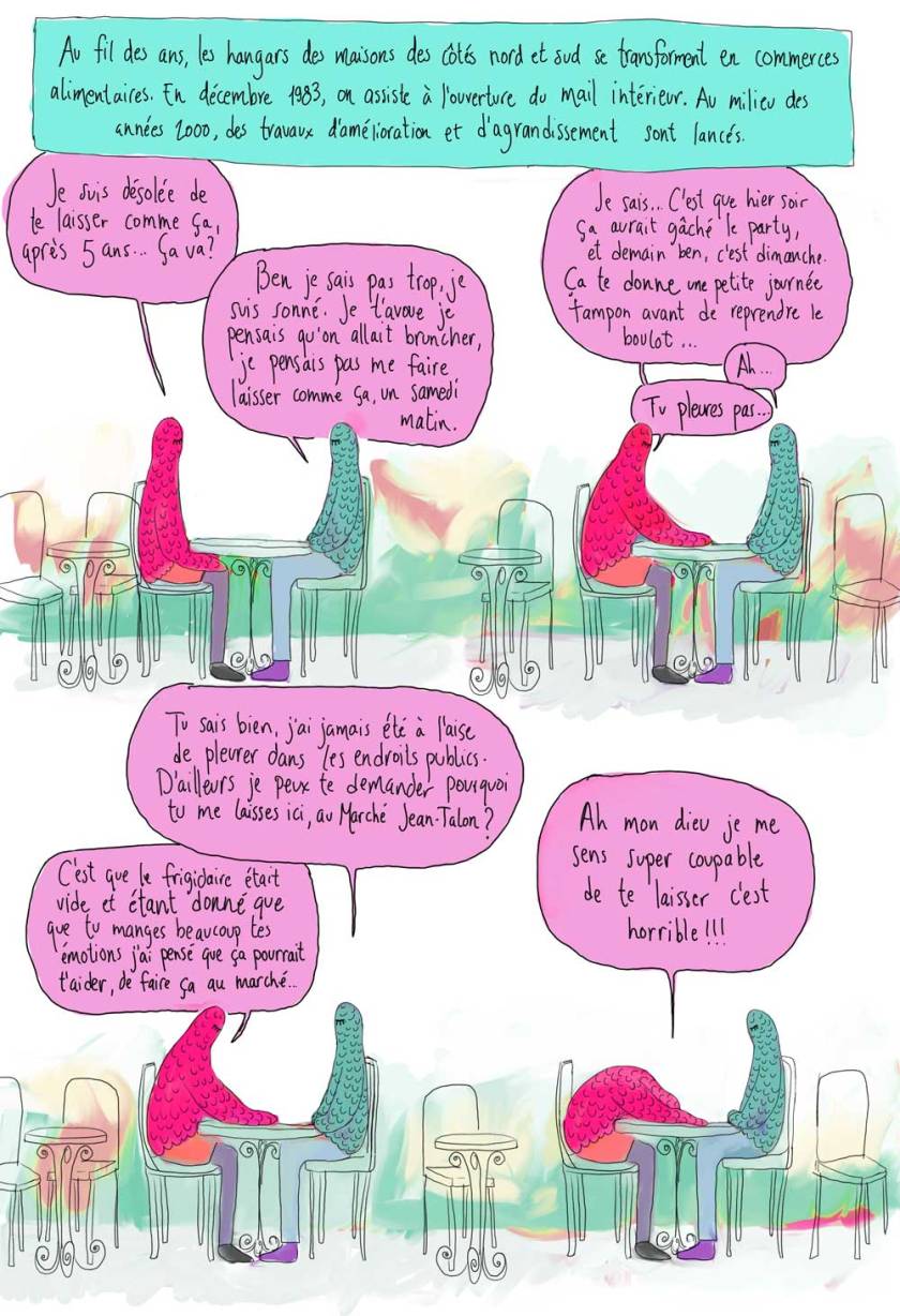 L’autrice a fait le choix de représenter ses personnages sans visage, tels des oiseaux. Ce choix est venu d’une volonté de réellement s’attarder aux discours, à ce que les personnages tentent de communiquer. On reconnaît entre ces pages, les artistes qu’elle a rencontrés, l’autrice elle-même et même sa fille. La bande dessinée n’est pas une histoire linéaire, c’est plutôt des petites parcelles de réflexion, de rencontres, de moments, qui lui permettent de représenter, à sa façon, ce que c’est la vie d’artiste. En mélangeant l’autofiction et ce qu’elle a conservé des rencontres avec les artistes, La vie d’artiste devient une œuvre intimiste qui raconte le parcours de 8 individus. Parallèlement, l’œuvre démontre avec justesse l’universalité des propos qui tourmente et habite les artistes.