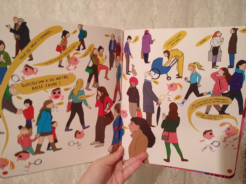 Si vous aimez les livres colorés, vous allez être servis avec La balle jaune de Daniel Fehr et Bernardo P. Carvalho! Tellement que parfois, j’avais de la difficulté à bien me situer dans l’image. J’ai parfois eu quelques difficultés à rester concentrée parce que les dessins vont dans tous les sens. Cependant, je crois que cela peut être très stimulant pour les jeunes enfants; toutes ces couleurs et le mystère qui rôde.